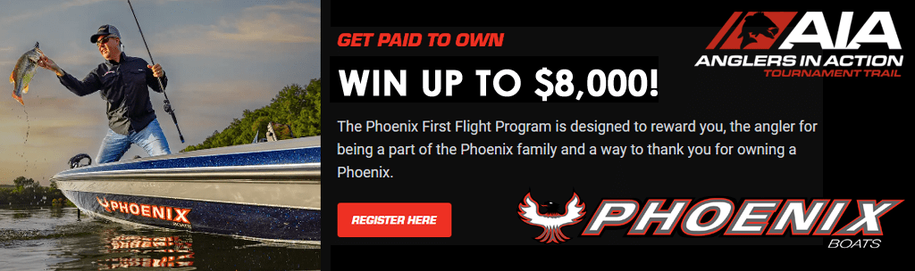 1st place at the 2026 AiA Tournament of Champions wins a 2027 Phoenix 819 ZXL with a Mercury 200 Pro XS boat package, plus up to $18,000 in cash if winning team is Anglers Port Marine and/or Phoenix First Flight incentive compliant.
