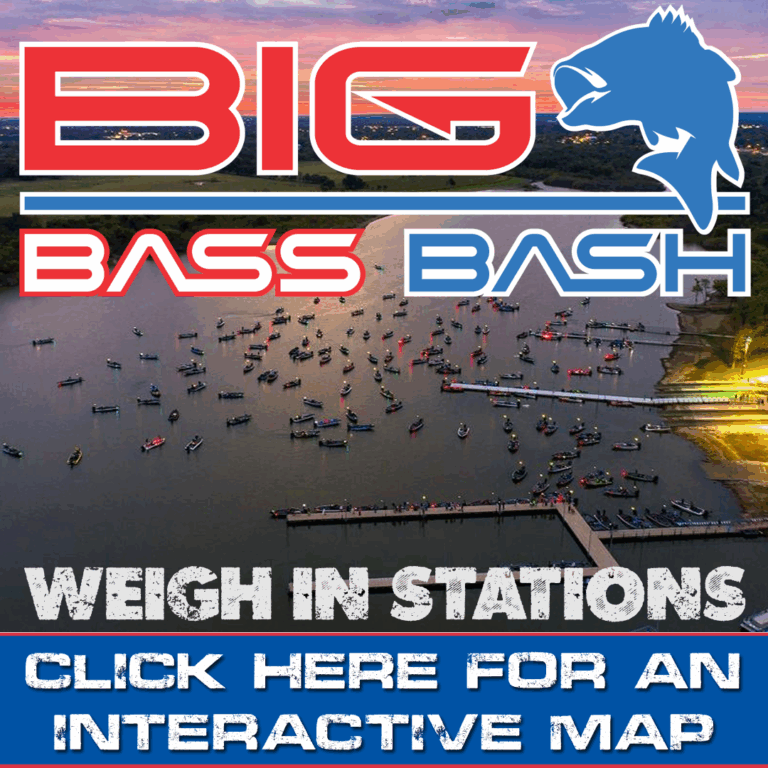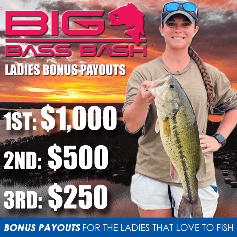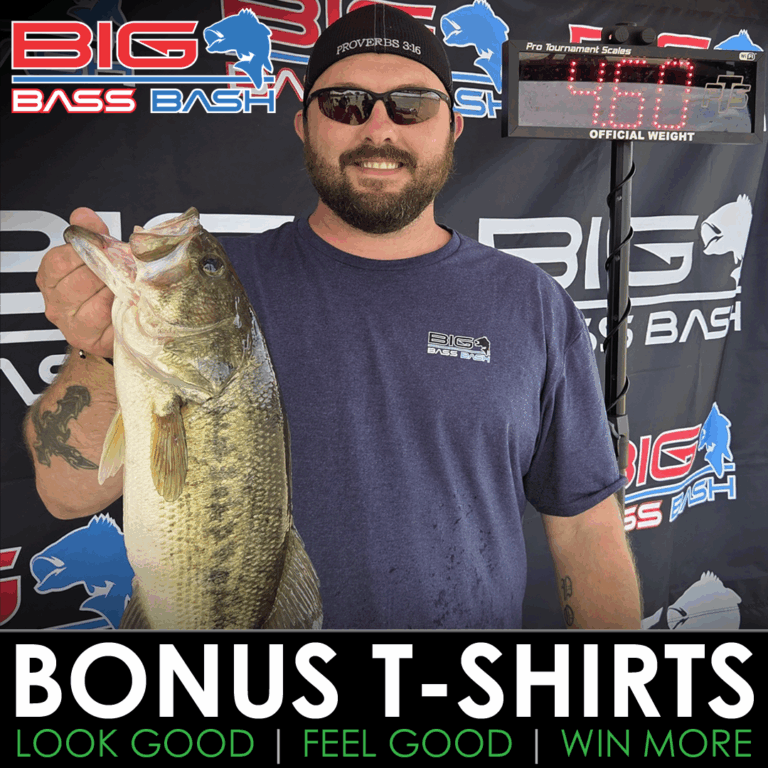 If your bass drops one spot out of the money in any time slot (21st place) you win $150. You must have your 2026 Grand Lake Big Bass Bash Bonus T-Shirt in your possession when weighing in.