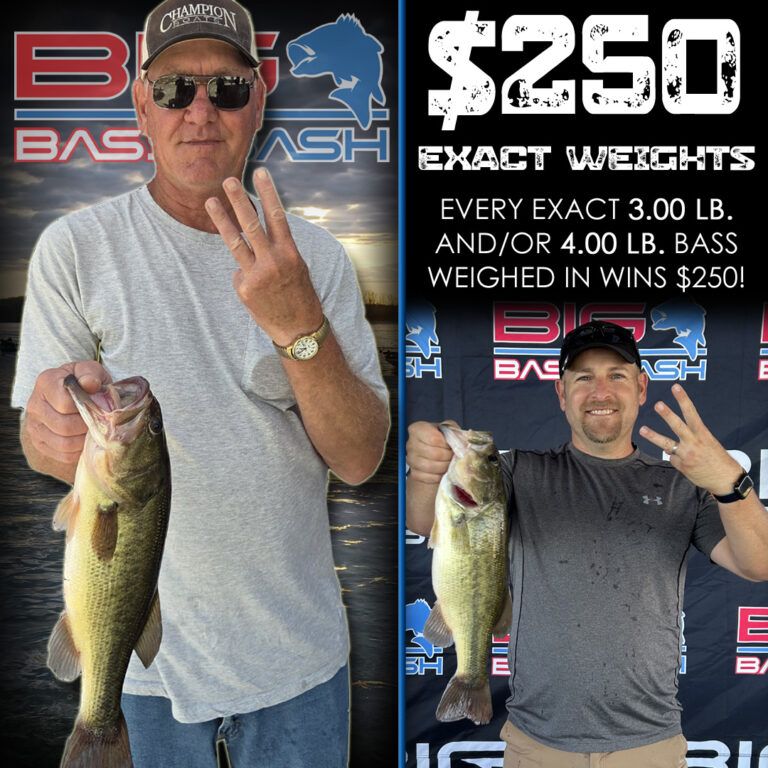 UNLIMITED 3 & 4 LB. EXACT WEIGHTS: Every angler that weighs in an exact 3.00 lb. and/or 4.00 lb. bass wins $250.