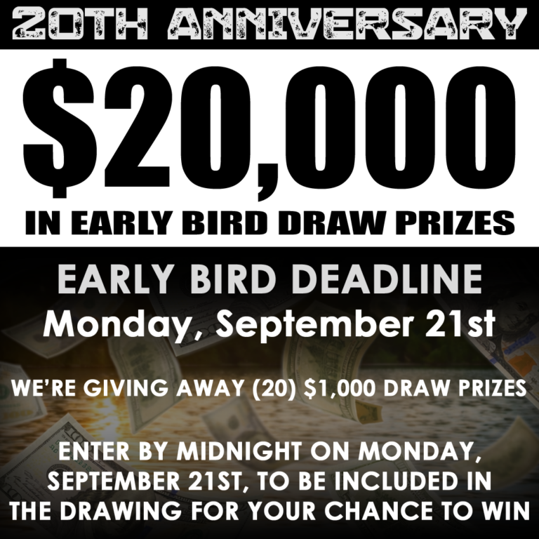 All anglers that enter by midnight on Monday, September 21st, will be included in the Early Bird Drawing where 20 lucky anglers will each win $1,000.