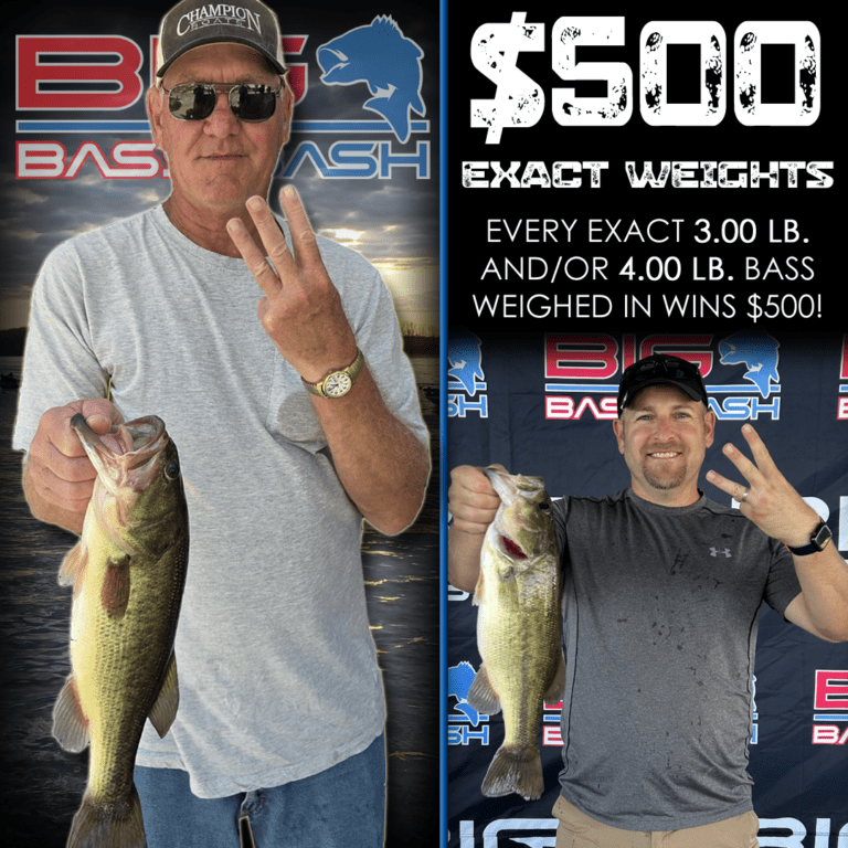 UNLIMITED 3 & 4 LB. EXACT WEIGHTS: Every angler that weighs in an exact 3.00 lb. and/or 4.00 lb. bass wins $500.