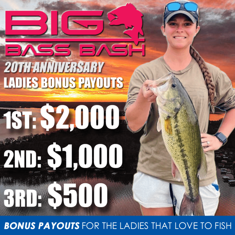 If your bass drops one spot out of the money in any time slot (46th place) you win $200. You must have your 2026 20th Anniversary Big Bass Bash Bonus T-Shirt in your possession when weighing in.